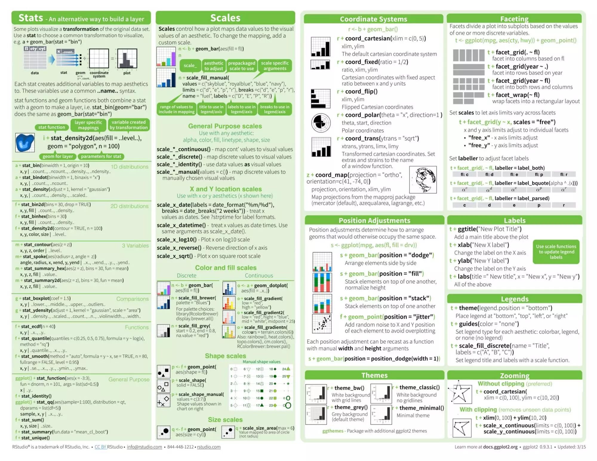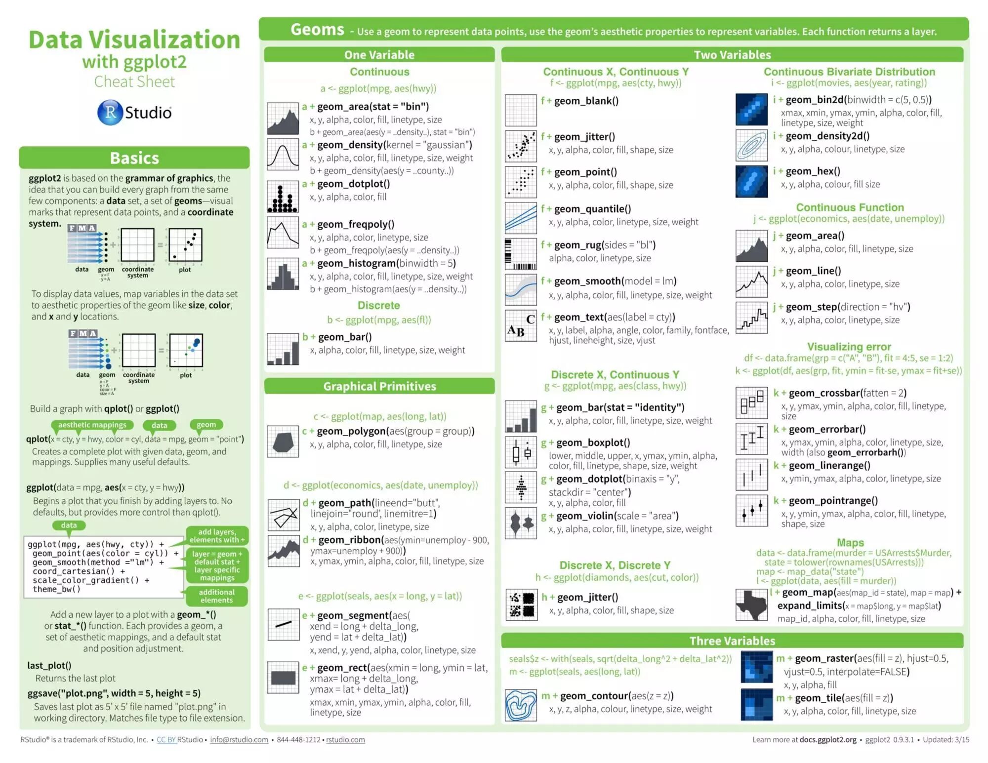 ggplot2 基于图形语法,其思想是你可以利用相同的几个组件构建所有的图形:一个数据集、一个几何集(表征数据点的视觉化标记)和一个协作系统。该速查表用于数据可视化。