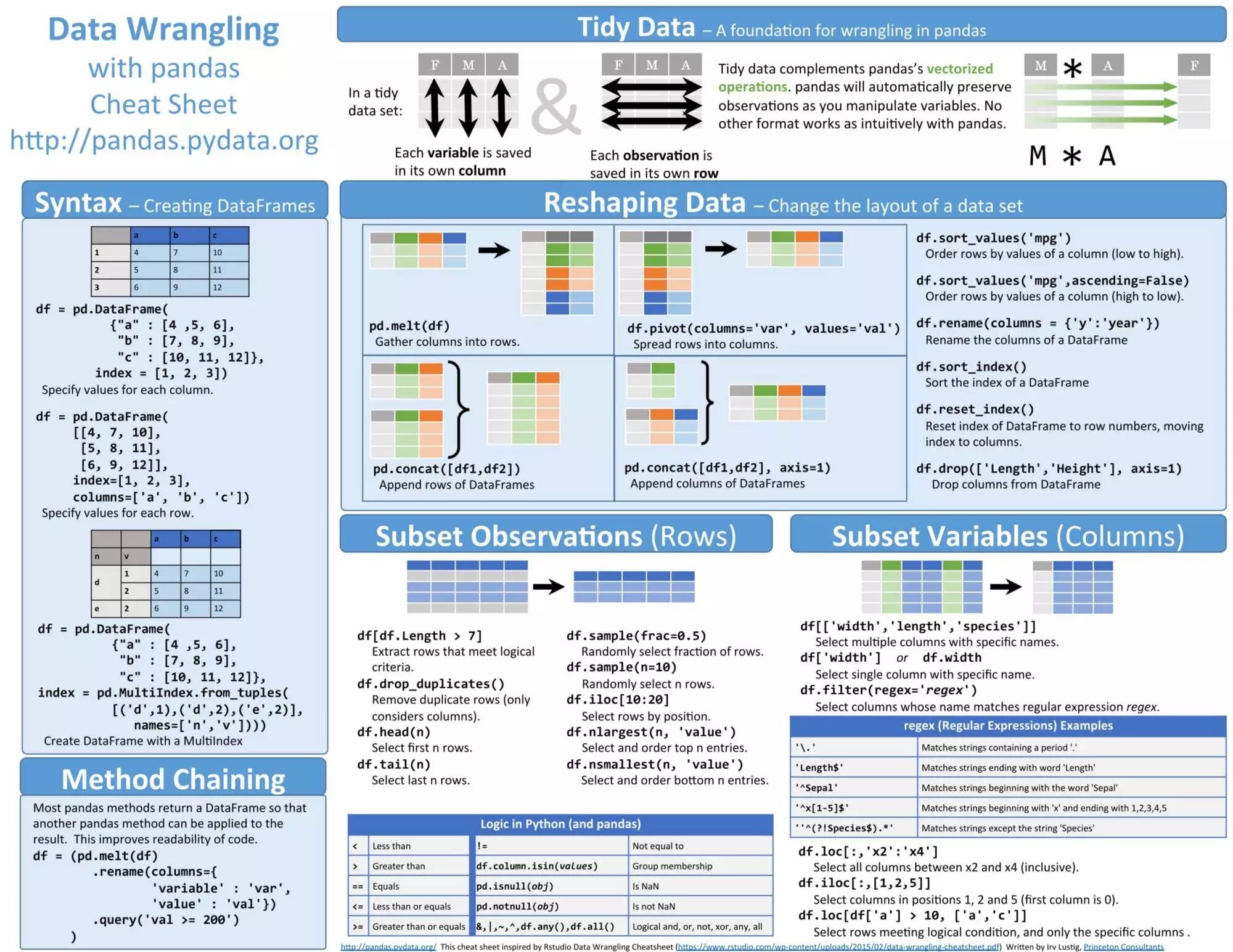 这张 Pandas 速查表主要用于数据整理(data wrangling)。