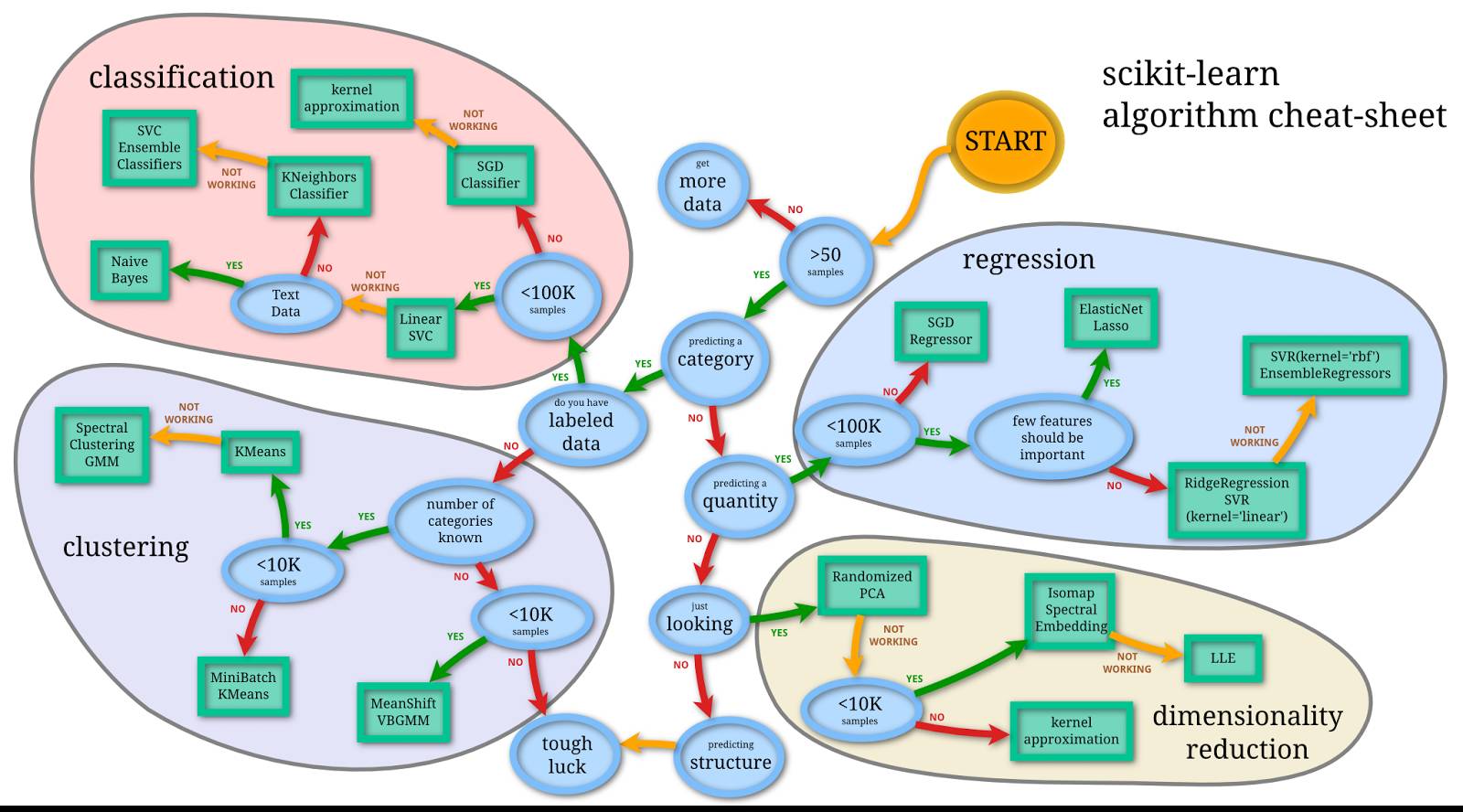 下面一张图展示了如何为我们工作和任务选择正确的 Scikit-learn 算法。其中每一个节点都是一个条件,然后按照要求和情况进行就可以找到管用的算法。比如说我们的数据量大于 50、需要预测类别、是标注数据、小于 100K 的数据、线性支持向量分类器不管用、不是文本数据、K 近邻分类器不管用,然后我们就只能选择最后的 SVC 集成分类器了。这种选择算法的速查表确实很管用,很适合我们没有什么机器学习开发经验的入门者使用,因为这会大大提高我们构建系统的效率。