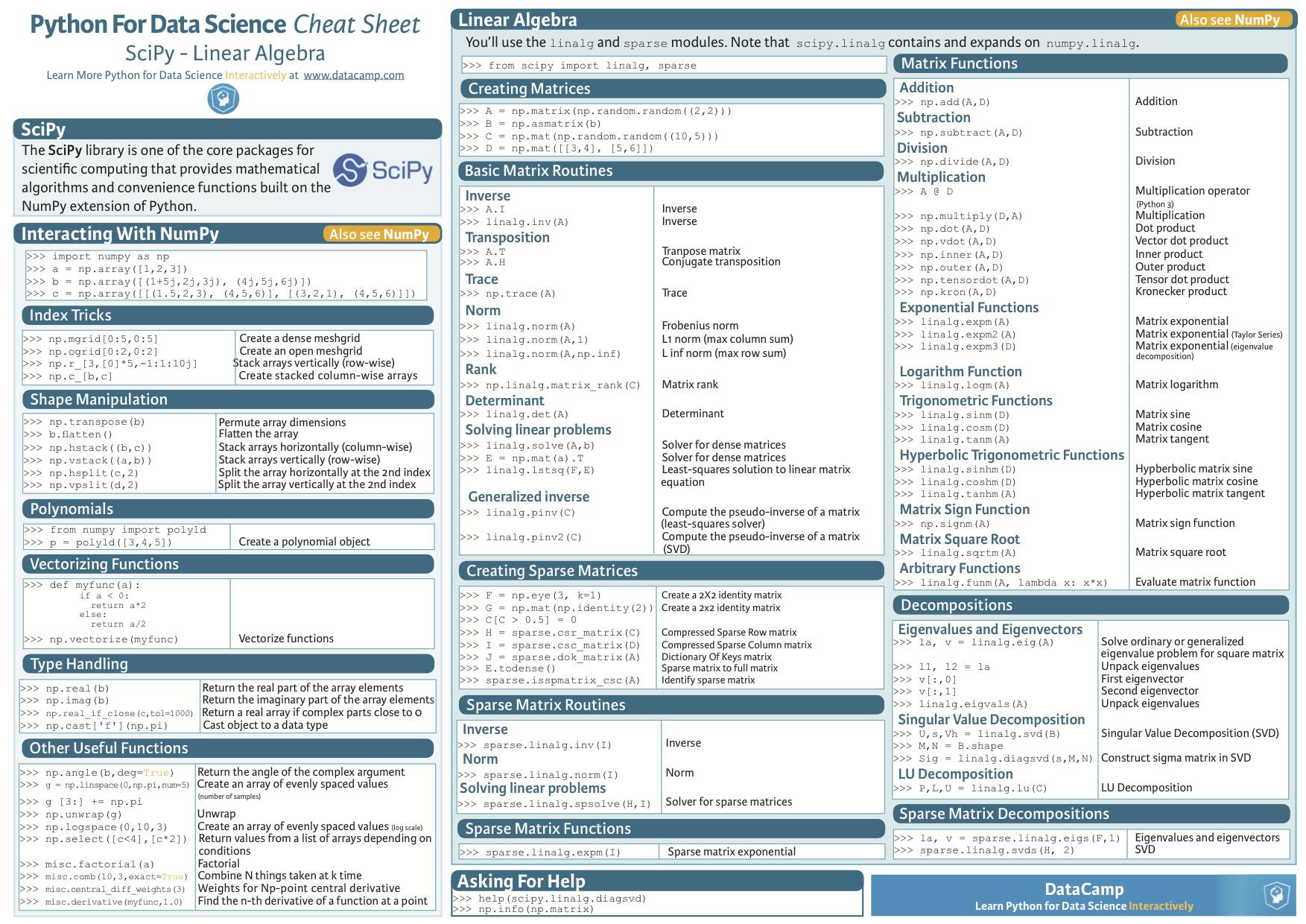 SciPy 库是科学性计算的核心包之一,科学性计算可提供数学算法和构建在 Python 的 NumPy 扩展上的便捷函数 (Convenience Functions) ;该表中还包括线性代数的部分。该速查表可用于 Python 数据科学和机器学习。